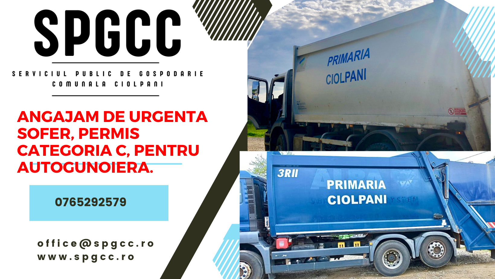 Angajam de urgenta sofer, permis categoria C, pentru autogunoiera. Detalii la tel. 0765292579 sau pe adresa de mail office@spgcc.ro.